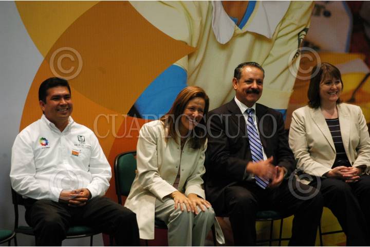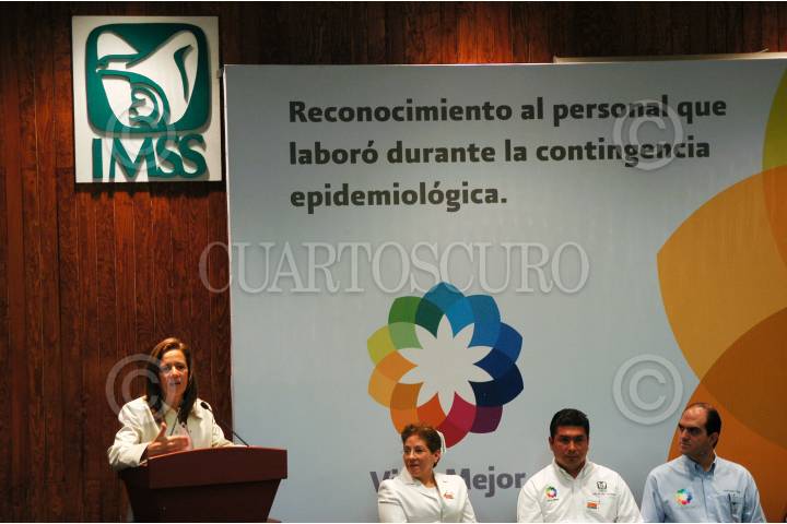 MÉXICO D.F., 26MAYO2009.- Margarita Zavala, Presidenta del D.I.F. Nacional, acompañada de Israel Sevilla, Delegado Sindical del IMSS, José Luis Duran, Presidente Municipal de Naucalpan, Margarita Darlene Rojas Olvera, Encargada de la Dirección General del D.I.F. en el hospital de Traumatología de Lomas Verdes, donde encabezo la ceremonia de reconocimiento al personal que laboro durante la contingencia epidemiológica, esto para evitar el contagio y propagación del virus de influenza AH1N1, tras el brote que se dio en nuestro país. FOTO: GUILLERMO PEREA/CUARTOSCURO.COM