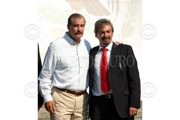 MEXICO, D.F., 09MAYO2006.- Vicente Fox Quesada, Presidente de la República y Ricardo Lavolpe, D.T. de la Seleccion Mexicana, durante el abanderó del tricolor que participará en el Mundial de Alemania, en la residencia oficial de los Pinos. FOTO: Moisés Pablo/CUARTOSCURO.COM