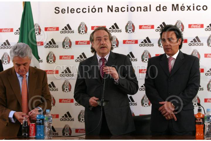 MÉXICO, D.F., 31ENERO2007.- Justino Compeán, Presidente de la FMF, Desio de María, Secretario de la FMF y Hugo Sánchez Márquez, D.T. de la Selección Mexicana, presentaron la lista de convocados para el juego que disputarán en el Estadio Azteca, en una conferencia de prensa en la Federación Mexicana. FOTO: MOISÉS PABLO/CUARTOSCURO.COM