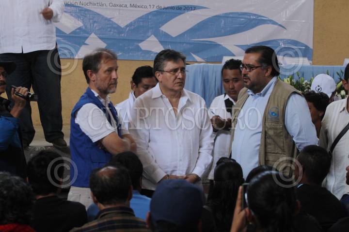 ASUNCIÓN NOCHIXTLÁN, OAXACA., 17JUNIO2017.- El presidente de la Comisión Nacional de los Derechos Humanos (CNDH), Luis Raúl González acudió al municipio de Asunción Nochixtlán a dos días de cumplirse un año del desalojo fallido realizado por la policía federal y estatal en dicha localidad. El ombudsman acudió acompañado del representante en México de La Oficina del Alto Comisionado de las Naciones Unidas para los Derechos Humanos y el defensor de los Derechos Humanos de los Pueblos de Oaxaca, Arturo Peimbert. Los tres sostuvieron un coversatorio con los familiares de víctimas y heridos del 19 de junio del 2016, tras esto recorrieron la colonia noviembre en donde un grupo de niños tuvo que ser rescatados debido a que estaban siendo afectados por los gases lacrimógenos que los policías utilizaron hace un año. FOTO: ARTURO PÉREZ ALFONSO /CUARTOSCURO.COM