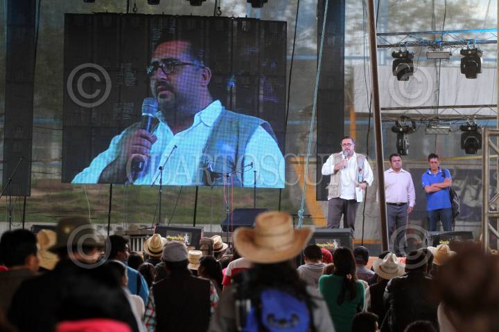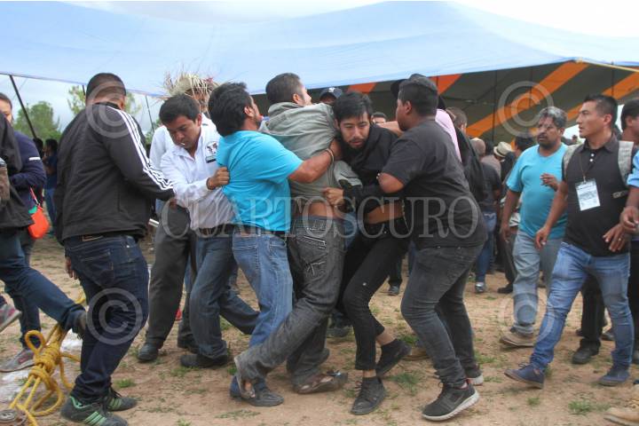 ASUNCIÓN NOCHIXTLÁN , OAXACA, 19JUNIO2017.- El defensor de los Derechos Humanos de los Pueblos de Oaxaca (DDHPO), Arturo Peimbert Calvo aseguró que la "masacre" de Nochixtlán cometida hace un año se realizó con recursos públicos. Al término de su participación en el concierto de clausura de actividades, David Venegas mejor conocido "El Alebrije" quien forma parte del colectivo "La Guardería" agredió a Peimbert Calvo a quien asestó una patada, tras lo cual fue retirado de la unidad deportiva, en tanto el defensor se fue del lugar por decisión propia. FOTO: ARTURO PÉREZ ALFONSO /CUARTOSCURO.COM
