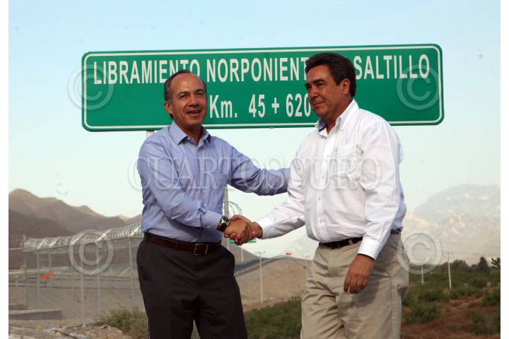 PUERTO VALLARTA, JALISCO, 05FEBRER2019.- Jorge Torres López, exgobernador interino de Coahuila, con un mandato de 10 meses y 27 días, luego de que Humberto Moreira, renunciara al cargo para asumir la presidencia nacional del PRI, fue detenido este martes por elementos de la Fiscalía General de la República en Puerto Vallarta, Jalisco. El ex gobernador, era buscado por la Administración para el Control de Drogas (DEA, por sus siglas en inglés), por presuntas operaciones con recursos de procedencia ilícita, fraude y lavado de dinero. En la imagen Felipe Calderón Hinojosa, ex presidente de México y Jorge Juan Torres López, se saludan durante la inauguración del libramiento Norponiente de Saltillo, que se realizó en este municipio en abril de 2011. FOTO: ARCHIVO /ALFREDO GUERRERO/CUARTOSCURO.COM