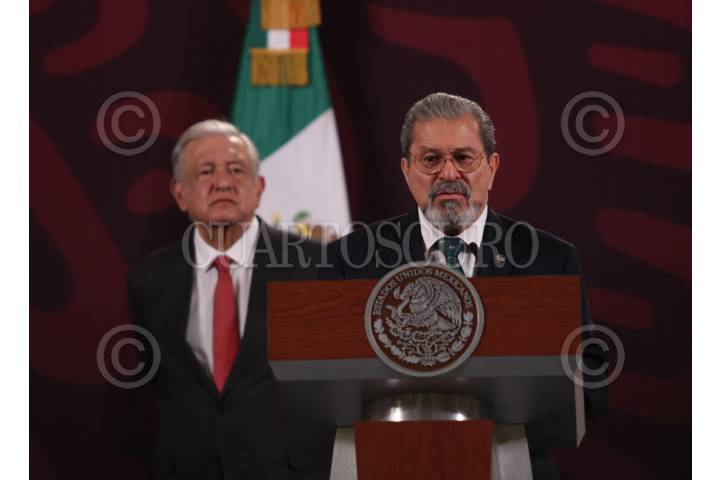 CIUDAD DE MÉXICO, 02MAYO2024.- Andrés Manuel López Obrador, presidente de México acompañado de Carlos Ignacio Velázquez Tiscareño, director general del Aeropuerto Internacional de la Ciudad de México (AICM) "Benito Juárez" de julio 2022 a marzo 2024 durante conferencia en Palacio Nacional. FOTO: ANDREA MURCIA /CUARTOSCURO.COM