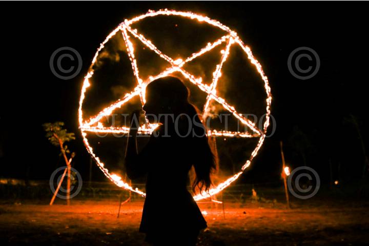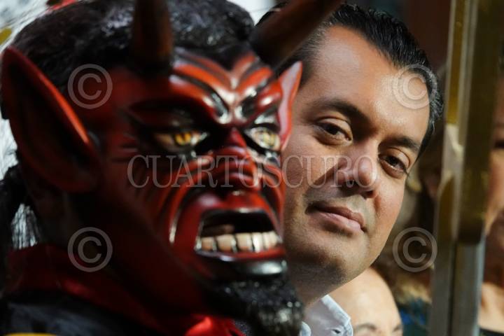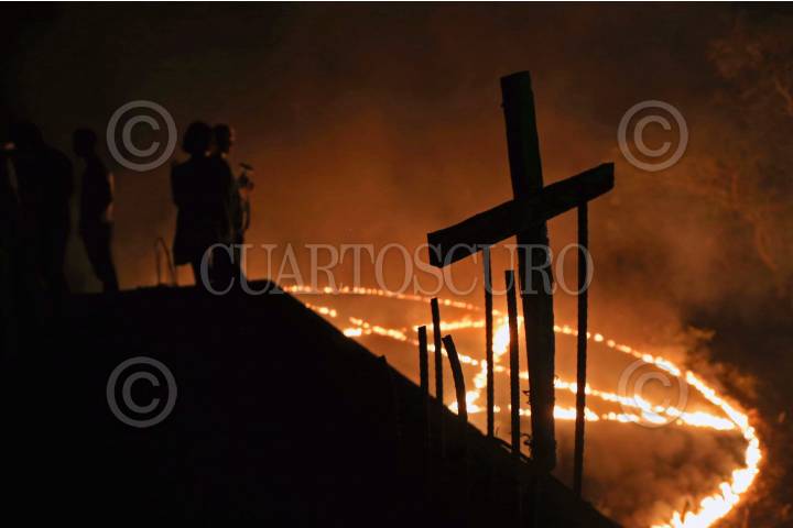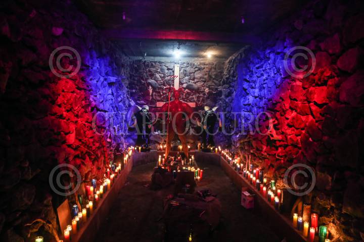 CATEMACO, VERACRUZ, 04MARZO16.- Como cada primer viernes de marzo la ciudad de Catemaco, bien conocida por sus curanderos y misticismo a nivel mundial, celebra el Día de Brujos. En el centro de la ciudad todo se ve tranquilo, luce vacío pero en la colonia El Paraíso, el ahijado del diablo o brujo mayor Enrique Marthén, prepara en el patio de su casa la llamada misa negra donde afirman abrir portales que convergen energías negativas y positivas rindiéndole tributos animales a el diablo. Hay todo tipo de gente, desde adultos hasta niños que ríen y corren por el lugar como si fuera salón de fiestas, el ambiente está plagado de un aire dulzón y pesado por el sahumerio. Ya van 4 años seguidos desde que se realiza este ritual y los asistentes ya son en su mayoría reporteros, fotógrafos y videógrafos quienes se mueven con toda libertad por el pentagrama de unos 5 metros de diámetro que adorna el escenario, hay luces artificiales por todo el sitio y micrófonos para que los asistentes puedan recibir mejor las palabras de los protagonistas. Mujeres en poca ropa sostienen humos o botellas de licor, hay varias figuras de Luzbel y una jóven yace sobre la mesa principal donde explican que esta vez la misa trata acerca de la fertilidad y cómo a partir de ella se puede sanar. 7 gallinas y 1 chivo fueron degollados para absorber, según Enrique, toda enfermedad de los presentes; con la sangre derramada los asistentes son manchados en la cara, afirma que los animales no sufren pero las gallinas negras son frotadas con fuerza sobre el cuerpo de algunos hasta que su cuello se rompe y al chivo le cortan la garganta hasta que se desangra, situaciones por las que esta celebración ya financiada por el ayuntamiento ha sido criticada fuertemente. La actividad finaliza con danzas prehispánicas y 2 pentagramas satánicos que arden e indican el cierre del portal que los brujos abrieron a lo largo de la misa, la gente es invitada a la cueva donde yace un enorme diablo y a tomarse fotos del recuerdo mientras que otros levantan sus manos hacia el fuego y lo observan hasta que se extingue. De a poco se apagan las cámaras y los asistentes regresan a sus casas para dar inicio así al mes en que Catemaco es más visitado, desde políticos, actores hasta extranjeros que buscan en la magia resolver problemas o saciar su morbo ante este tema tan popular. FOTO: ILSE HUESCA /CUARTOSCURO.COM