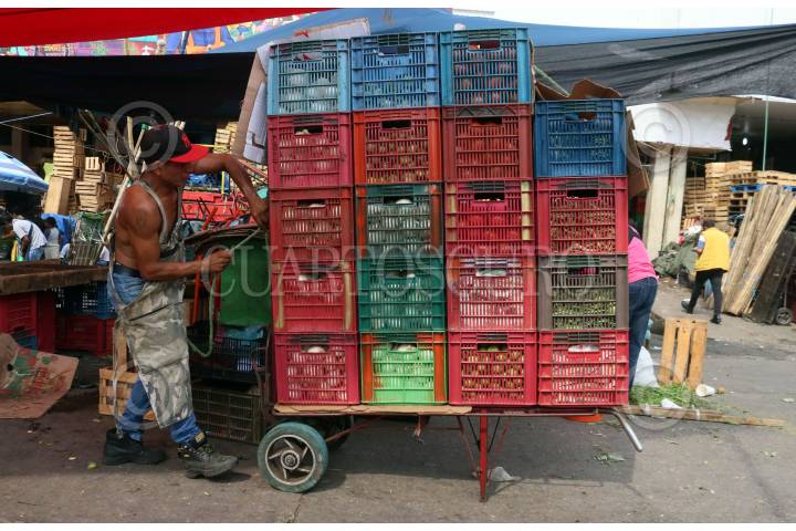 Un hombre carga un diablo con cajas de huevo en el mercado Adolfo López Mateos.