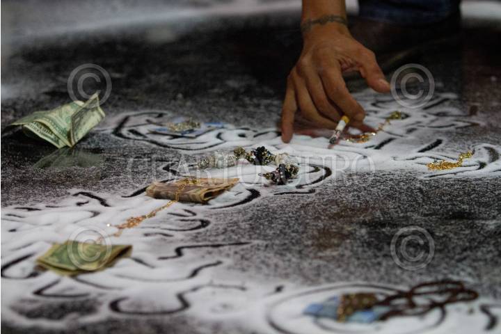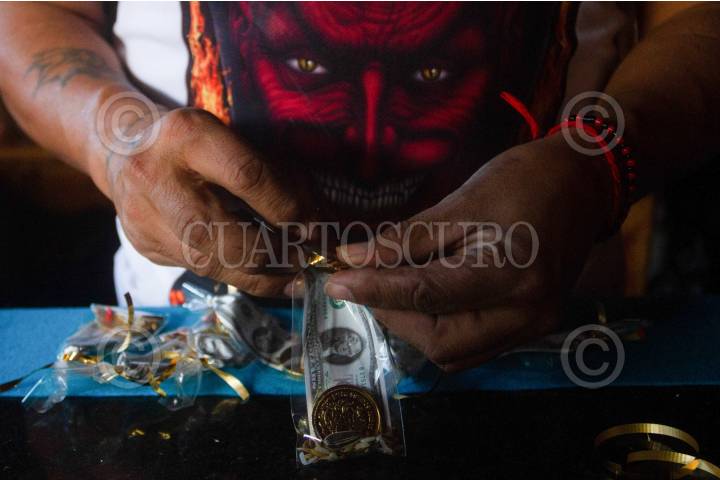 Un creyente del "Ángel Negro" envuelve amuletos para la ceremonia que se realiza cada primer viernes de mes en el santuario del Palacio Negro de Luz Bella de la Oscuridad