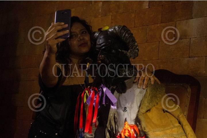 Una mujer se toma una selfie con la escultura del "Ángel Negro" durante el festejo que se le realiza cada primer viernes de mes el santuario del Palacio Negro de Luz Bella de la Oscuridad