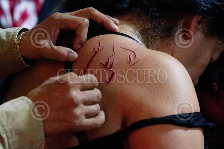 Óscar Pelcaste, obispo de la Santa Muerte, realiza "el rayado" a una creyente como protección durante un ritual dedicado al "Ángel Negro"