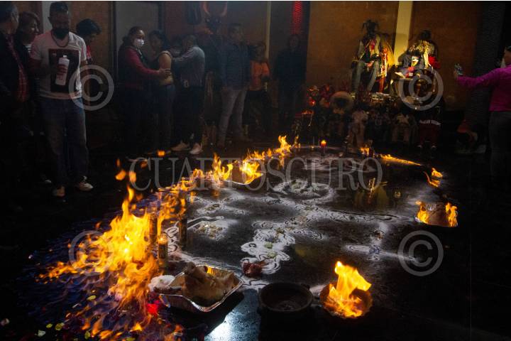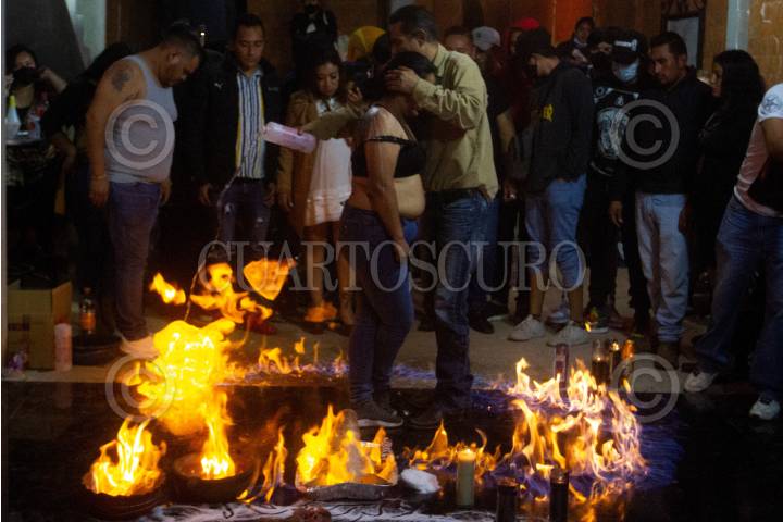Óscar Pelcaste, obispo de la Santa Muerte, prende fuego a la ofrenda dedicada al "Ángel Negro" en el santuario del Palacio Negro de Luz Bella de Oscuridad
