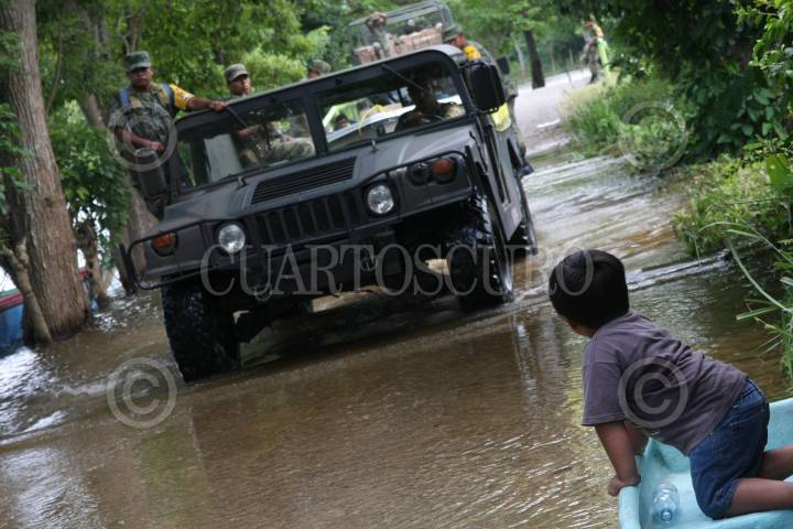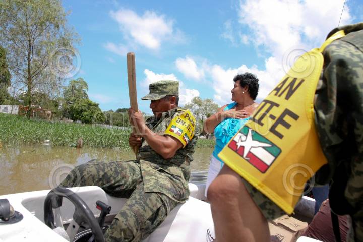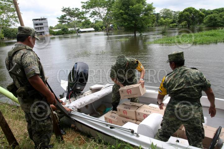VILLAHERMOSA, TABASCO, 03SEPTIEMBRE2010.- Elementos del Ejercito Mexicano de la 30 Zona Militar aplicación del Plan D-III-E realizando entregas de despensas en zonas inundadas por el desborde del rio Grijalva. Revelan las autoridades castrense que han entregado en promedio dos mil 300 distribución de despensas de manera simultanea en los municipios de Cunduacan, Nacajuca, Macuspana, Centla y Centro; en la imagen entregan el apoyo en el sector los Acosta. FOTO: MARCO POLO GUZMAN HERNANDEZ/CUARTOSCURO.COM