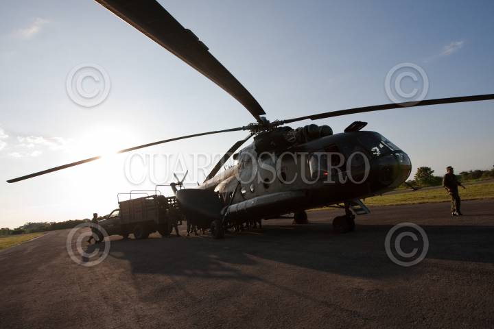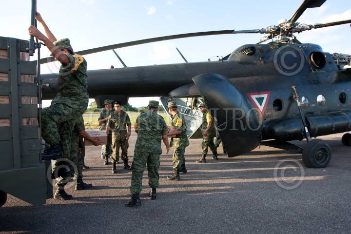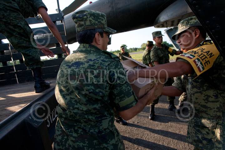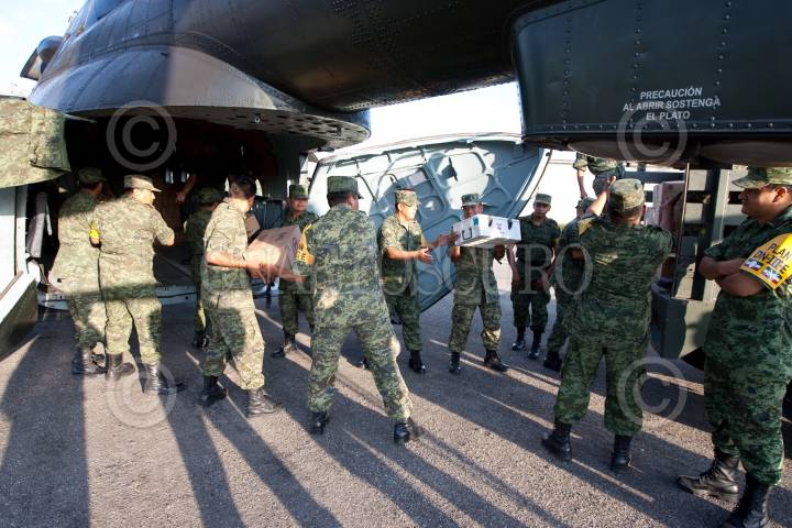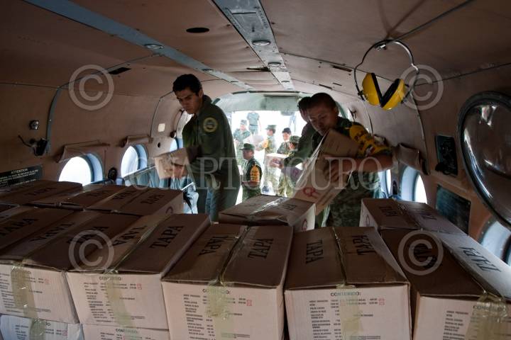 MACUSPANA, TABASCO, 240CTUBRE2011.- Elementos militares y de la Fuerza Aérea de la Secretaría de la Defensa Nacional adscritos a la Base Aérea Militar 16 y bajo el mando del Coronel Federico Nova Ramirez despacharon a las aeronaves con despensas del FONDEN en la fase de la aplicación del Plan DN-III-E que serán repartidas a los habitantes que se encuentran inundados por los desbordes de ríos que provocan las intensas lluvias. FOTO: MARCO POLO GUZMÁN HERNÁNDEZ/CUARTOSCURO.COM