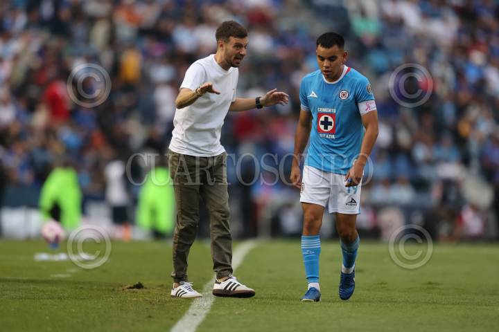 CIUDAD DE MÉXICO, 05OCTUBRE2024. El DT Martín Anselmi da indicaciones al capitán de la Máquina Celeste, Carlos Rodríguez durante el partido de fútbol Cruz Azul vs Necaxa correspondiente a la jornada 11 del Torneo Apertura 2024 de Liga BBVA MX, en el Estadio Ciudad de los Deportes. FOTO: EDGAR NEGRETE LIRA/CUARTOSCURO.COM