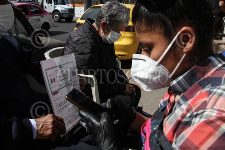 Con ayuda de un celular, ciudadana ayuda al registro de adultos mayores para su vacunación.