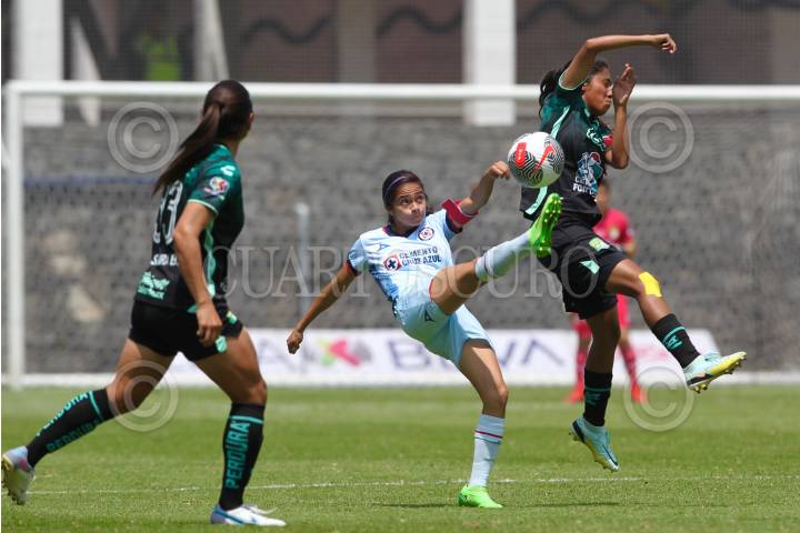 CIUDAD DE MÉXICO, 30SEPTIEMBRE2023. Dalia Molina de Cruz Azul y Bernarda Díaz de León disputan una pelota durante el partido de fútbol Cruz Azul vs León correspondiente a la jornada 12 del Torneo Apertura 2023 de Liga BBVA MX Femenil, en instalaciones de La Noria. FOTO: EDGAR NEGRETE/CUARTOSCURO.COM