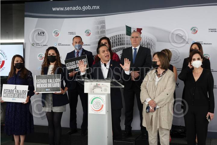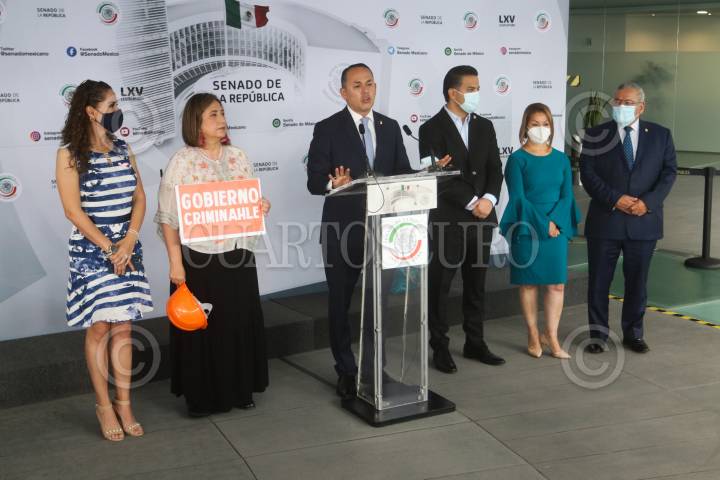 Los senadores Estrella Rojas, Xóchitl Gálvez, Erandi Bermúdez, Damián Zepeda, Minerva Hernández y Alfredo Botello encabezaron una conferencia de prensa en el Patio del Federalismo