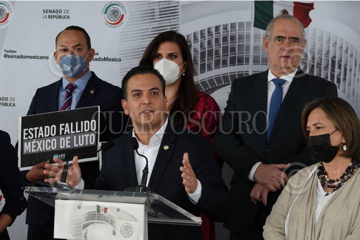 Los senadores Xóchitl Gálvez, Damián Zepeda, Kenia López Rabadán, junto con el diputado José Elía Lixa encabezaron una conferencia en el Patio del Federalismo