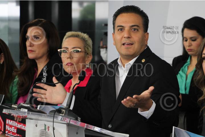 El senador Julen Rementería, coordinador del grupo parlamentario del PAN, acompañado de senadores de esta bancada, protestaron en contra de la militarización del país, en el Patio del Federalismo