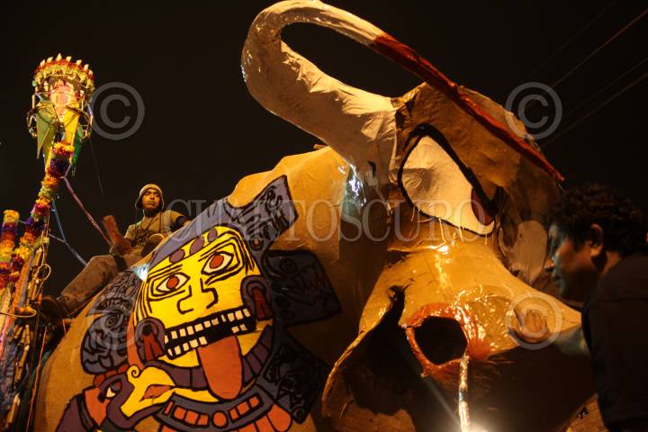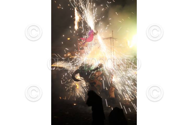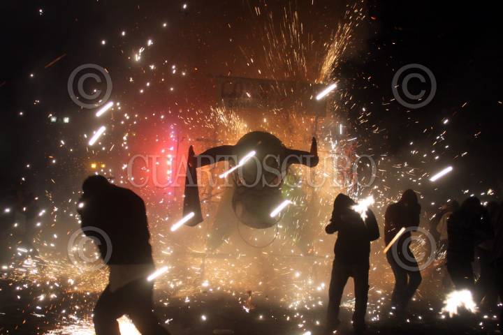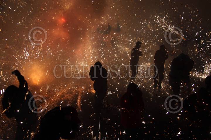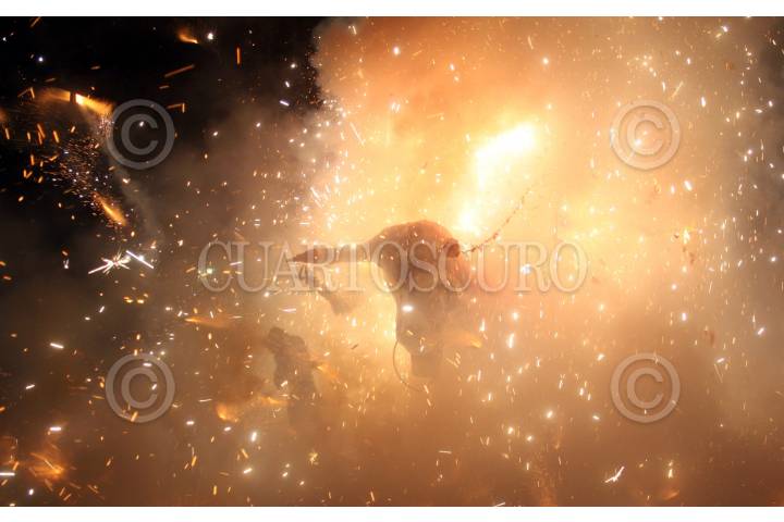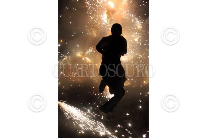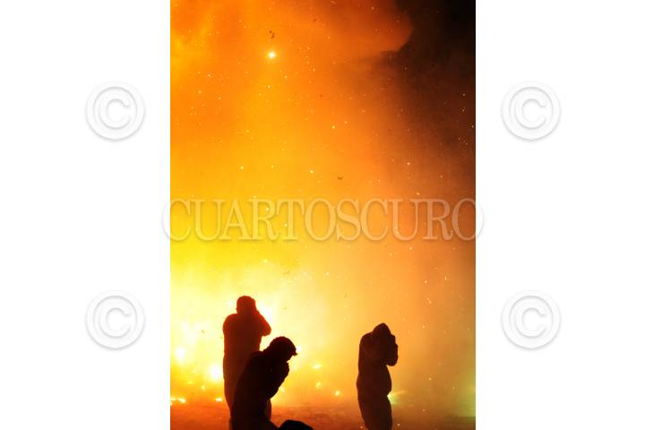 TULTEPEC, ESTADO DE MÉXICO 09MARZO2010.- Del 6 al 15 de Marzo se realiza en Tultepec la feria de la pirotécnia, teniedo diversas actividades relacionados con los juegos artificiales. La noche de ayer, los habitantes del lugar festejaron a San Juan de Dios, patrono de los pirotécnicos, por lo que fueron quemados más de cien “toritos” en una actividad llamada "pamplonada pirotecnica", donde cientos de jóvenes se dan cita en la en la plaza municipal para brincar alrededor de las luces de artificio que son expulsadas de los "toritos". Las personas que acuden a esta festividad suman los 100 mil visitantes. FOTO: SÁSHENKA GUTIÉRREZ/CUARTOSCURO.COM