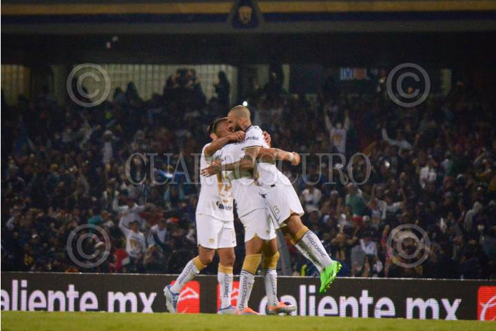 Nicolás Freire, festeja su anotación cargando a Dani Alves, mediocampista de los Pumas, en partido correspondiente a la jornada 5 de la Liga MX frente al Mazatlán.