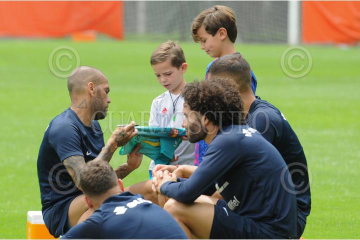 El mediocampista brasileño, Dani Alves, firma autógrafos al término de la práctica.