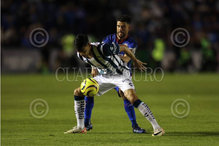 CIUDAD DE MÉXICO, 13ENERO2024. Gabriel Hernández de Cruz Azul es marcado por Daniel Aceves de Pachuca durante el partido de fútbol Cruz Azul vs Pachuca correspondiente a la jornada 2 del Torneo Clausura 2024 de Liga BBVA MX, en el Estadio Ciudad de los Deportes. FOTO: EDGAR NEGRETE LIRA/CUARTOSCURO.COM