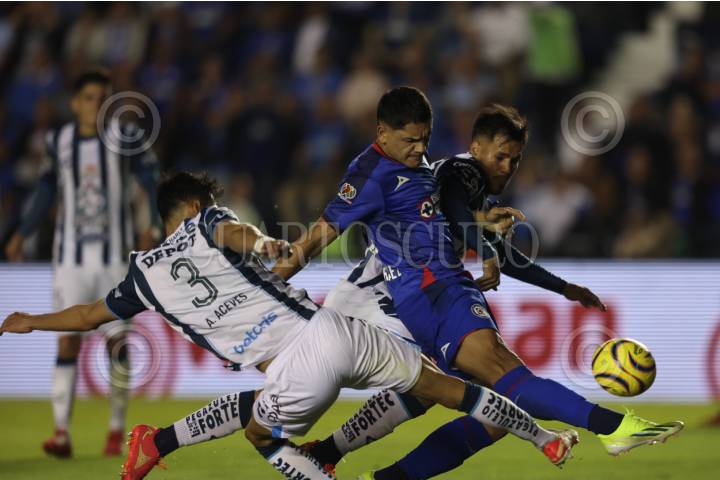 CIUDAD DE MÉXICO, 13ENERO2024. Gonzalo Piovi de Cruz Azul marca a Daniel Aceves de Pachuca durante el partido de fútbol Cruz Azul vs Pachuca correspondiente a la jornada 2 del Torneo Clausura 2024 de Liga BBVA MX, en el Estadio Ciudad de los Deportes. FOTO: EDGAR NEGRETE LIRA/CUARTOSCURO.COM