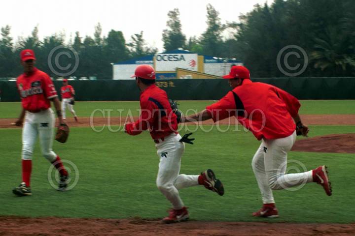 Los Diablos Rojos de México entrenaron hoy en el foro Sol, Daniel Fernández y el Pitcher Ojeda en jugada hacia el home. FOTO: David Bolaños/CUARTOSCURO.COM