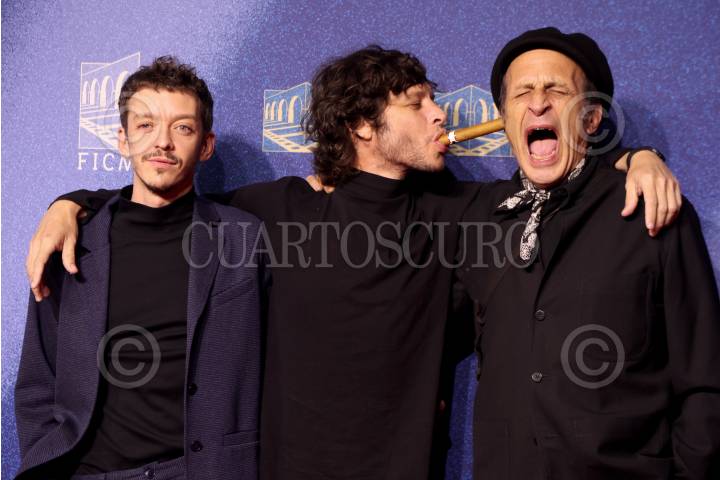 MORELIA, MICHOACÁN, 20OCTUBRE2024. Nahuel Perez Biscayart , Luis Ortega y Daniel Gimenez Cacho a su paso por la alfombra roja del la película “El Jockey”, como parte de las actividades del 22° Festival Internacional de Cine de Morelia. FOTO: EDGAR NEGRETE LIRA/CUARTOSCURO.COM