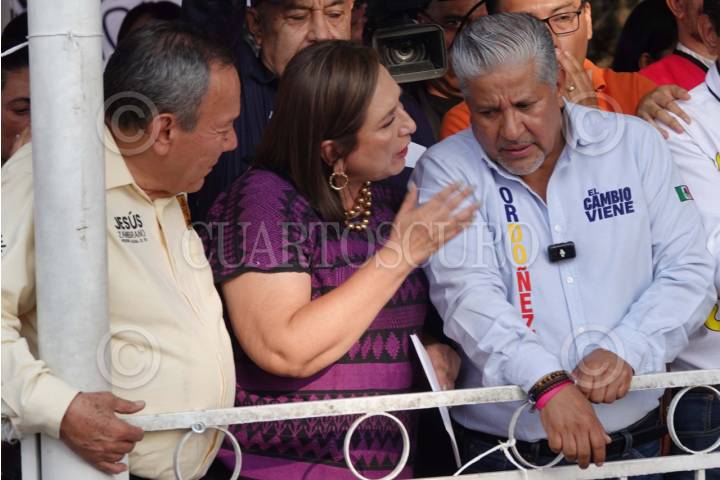 CIUDAD DE MÉXICO, 07MAYO2024.- Jesús Zambrano, presidente Nacional del PRD; Xóchitl Gálvez, candidata a la presidencia "Fuerza y corazón por México", y Daniel Ordóñez, candidato a alcalde por Iztacalco, conversaron durante un mitin en Plaza San Matías. FOTO: GRACIELA LÓPEZ /CUARTOSCURO.COM