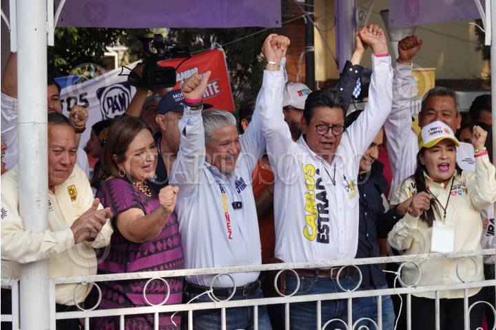 CIUDAD DE MÉXICO, 07MAYO2024.- Jesús Zambrano, presidente Nacional del PRD; Xóchitl Gálvez, candidata a la presidencia "Fuerza y corazón por México"; Daniel Ordóñez, candidato a alcalde por Iztacalco; Carlos Estrada, candidato a Diputado Federal, y Verónica Beatriz Juárez Piña, candidata a senadora, durante un mitin en Plaza San Matías. FOTO: GRACIELA LÓPEZ /CUARTOSCURO.COM
