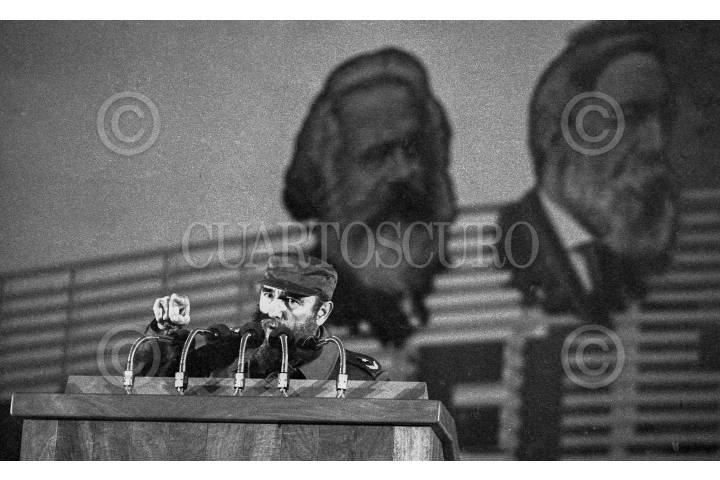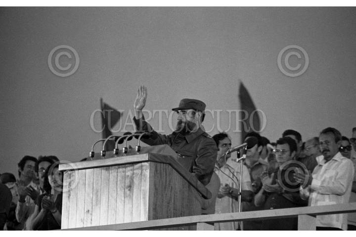 LA HABANA, CUBA, 26NOVIEMBRE2016.- El comandante Fidel Castro Ruz, quien fuera uno de los autores de la revolución en Cuba, murió el día ayer, según lo informado por su hermano Raúl Castro, actual presidente de la isla. Se preparan exequias por nueve día para despedir al cubano, de quien hoy decenas de líderes mundiales lo califican de imprescindible en la historia del siglo XX. En la imagen, tomada el 01 de mayo de 1980, Castro encabeza un mitín en la Plaza de la Revolución por el día del trabajo, lo acompañaron los presidentes Maurice Bishop de Granada y Daniel Ortega de Nicaragua, quienes lo respaldaron por la crisis por el éxodo de Mariel. FOTO: ARCHIVO PEDRO VALTIERRA /CUARTOSCURO.COM