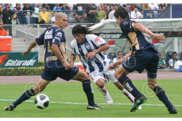 MÉXICO, D.F., 13SEPTIEMBRE2009.- Damián Álvarez del Pachuca momentos antes de anotar, burla la marca de Darío Verón y Marco Palacios jugadores universitarios, en la jornada 8 del Torneo Apertura 2009. Los Pumas de la UNAM perdieron nuevamente en el estadio Olímpico Universitario por un marcador de 1-2 en favor de los visitantes. FOTO: MISAEL VALTIERRA/CUARTOSCURO.COM