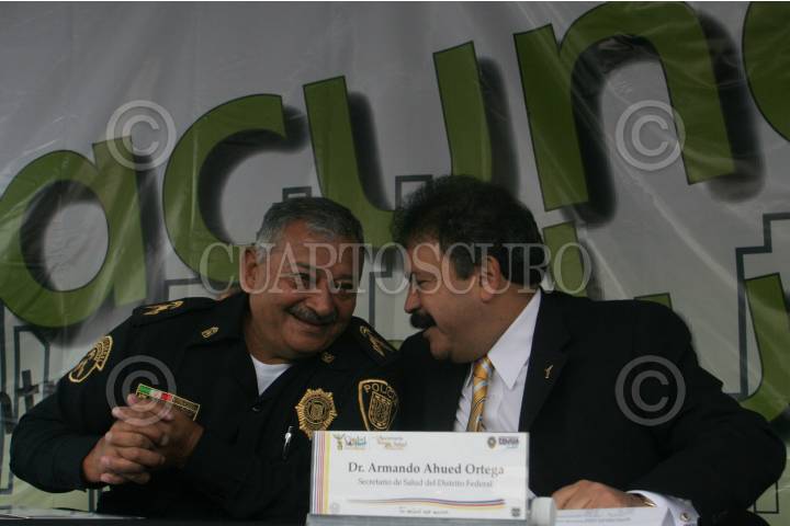 MÉXICO, D.F., 28ENERO2010.- Darío Chacón Montejo, subsecretario de operación policial conversa con Armando Ahued secretario de Salud del Distrito Federal durante el banderazo de la campaña de vacunación a elementos de Seguridad Pública. FOTO: ENRIQUE ORDOÑEZ/CUARTOSCURO.COM