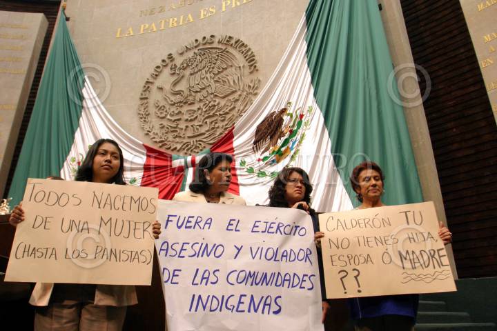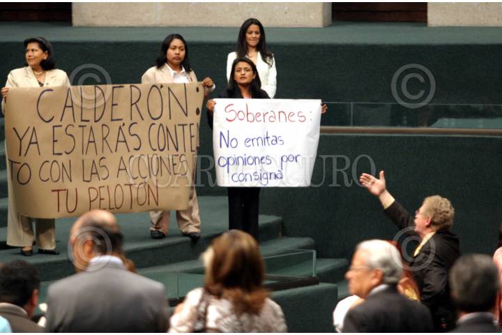 MÉXICO, D.F., 29MARZO2007.- Las diputadas del PRD Valentina Batres, Maribel Alba Olvera, Daysi Hernández Gaytán, Aleida Nuñez y Laida Sansores, sacaron varias pancartas en contra de Soberanes y Felipe Calderón, Presidente de la República, por según ellas de estar protegiendoa los militares que golperon y asesianron a una mujer de la tercera edad en Zongolica Veracruz, durante la sesión en la Cámara de Diputados. FOTO: MOISÉS PABLO/CUARTOSCURO.COM