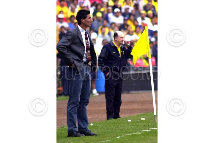 El "Yayo" de la Torre y Manuel Lapuente, entrenadores de Guadalajara y América, en una edición más del clásico del futbol mexicano. El marcador de este encuentro finalizó 1-1, a pesar de que el equipo local jugó 23 minutos frente al rival que solo contaba con 10 hombres. FOTO: Juan Pablo Zamora/CUARTOSCURO.COM