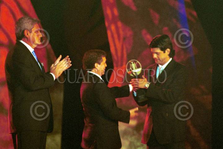 Alberto de la Torre y Manuel de la Graza le entregan el premio a José Saturnino Cardozo por haber sido el mejor goleador del torneo de apertura. FOTO:Moisés Pablo/CUARTOSCURO.COM