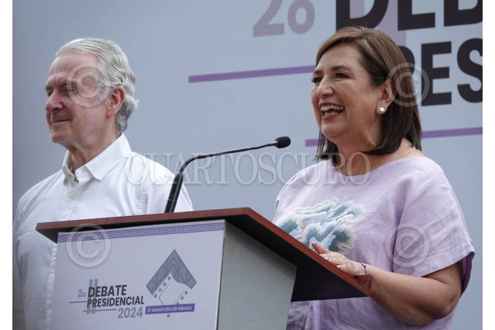 CIUDAD DE MÉXICO, 28ABRIL2024. - Xóchitl Gálvez, candidata presidencial de la coalición Fuerza y Corazón por México, llega las instalaciones de los Estudios Churubusco para participar en el segundo debate. FOTO: DANIEL AUGUSTO /CUARTOSCURO.COM