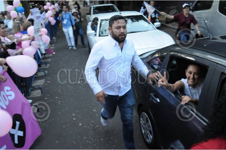 CIUDAD DE MÉXICO, 28ABRIL2024.- Claudia Sheinbaum, candidata presidencial de Morena, saluda a sus simpatizantes a su llegada al segundo debate. FOTO: DANIEL AUGUSTO /CUARTOSCURO.COM