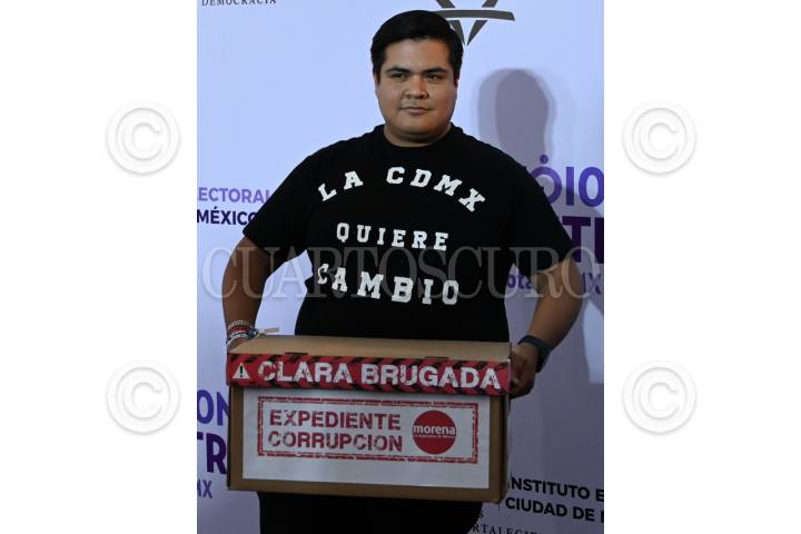 CIUDAD DE MÉXICO, 12MAYO2024.- Una persona que llegó junto a Santiago Taboada, lleva consigo una caja con la leyenda "Clara Brugada, expediente de corrupción". FOTO: DANIEL AUGUSTO/ CUARTOSCURO.COM