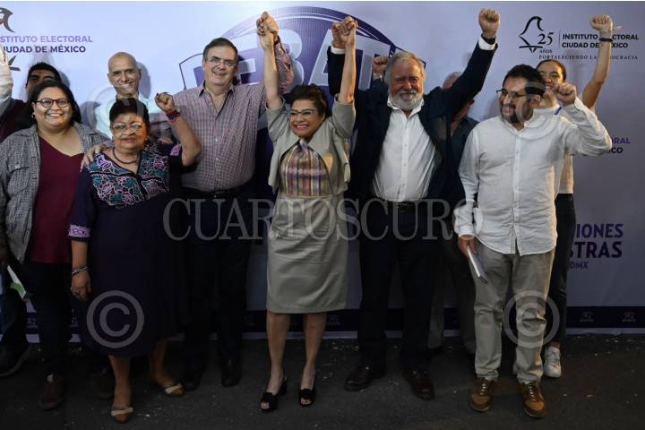 CIUDAD DE MÉXICO, 12MAYO2024.- Marcelo Ebrard, candidato a senador de Morena, levanta el brazo de Clara Brugada al llegar al tercer debate por la jefatura de gobierno. FOTO: DANIEL AUGUSTO/ CUARTOSCURO.COM