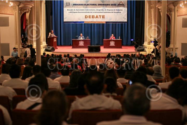 ZACATECAS, ZACATECAS, 30ABRIL2025.- Fue realizado el debate entre los candidatos por la Rectoría de la Universidad Autónoma de Zacatecas. En punto de las 10:30 hrs, la candidata Jenny Gonzalez Arenas, secretaria general de Sindicato del Personal Académico de la UAZ con licencia; y el candidato Ángel Román Gutierrez, secretario general de la UAZ con licencia; se presentaron en el Teatro Calderón, en donde la Comisión Electoral de la UAZ, organizó la actividad para el proceso electoral 2025. FOTO: ADOLFO VLADIMIR /CUARTOSCURO.COM