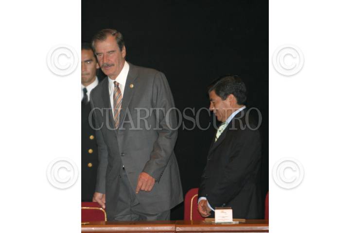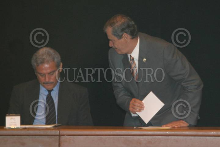 MEXICO, D.F. 11MARZO2005.- Alberto Cárdenas, secretario del medio ambiente conversa con el presidente Vicente Fox durante ceremonia de Compromiso Nacional por la Decada de la Educación para el Desarrollo Sustentable. FOTO: Nelly Salas/CUARTOSCURO.COM