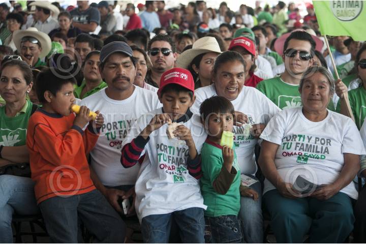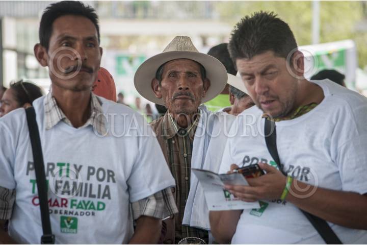 PACHUCA, HIDALGO, 08MAYO2016.- Simpatizantes del candidato a la gubernatura del estado por la alianza PRI, Partido Verde y Nueva Alianza, Omar Fayad, durante un evento proselitista en la explanada Bicentenario, para firmar un decálogo de política verde, en el que Fayad se compromete a realizar políticas públicas a favor de la conservación del medio ambiente y los recursos naturales, en caso de ganar las elecciones del próximo 5 de junio. FOTO: DIEGO SIMÓN SÁNCHEZ /CUARTOSCURO.COM