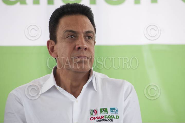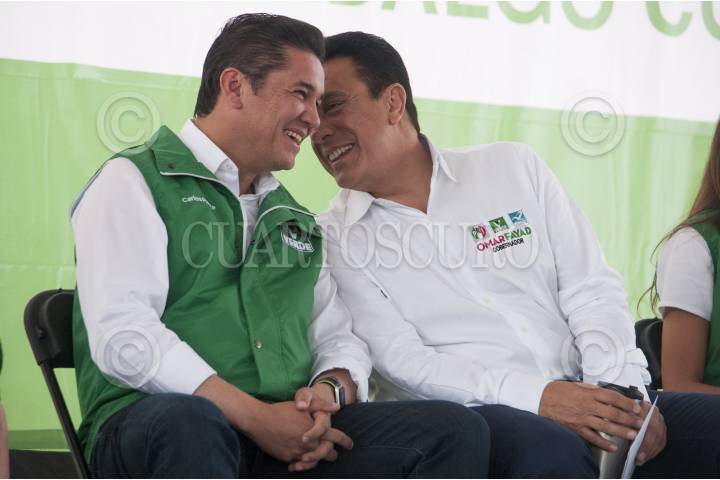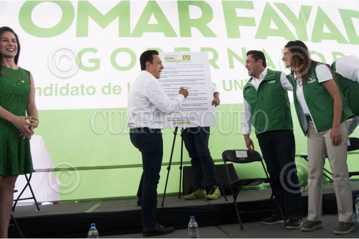 PACHUCA, HIDALGO, 08MAYO2016.- Omar Fayad, candidato a la gubernatura del estado por la alianza PRI, Partido Verde y Nueva Alianza, acompañado por el senador Carlos Alberto Puente, vocero nacional del Partido Verde y Alma Arzaluz Alonso, diputada del Partido Verde, realizó un evento proselitista en la explanada Bicentenario, para firmar un decálogo de política verde, en el que se compromete a realizar políticas públicas a favor de la conservación del medio ambiente y los recursos naturales, en caso de ganar las elecciones del próximo 5 de junio. FOTO: DIEGO SIMÓN SÁNCHEZ /CUARTOSCURO.COM