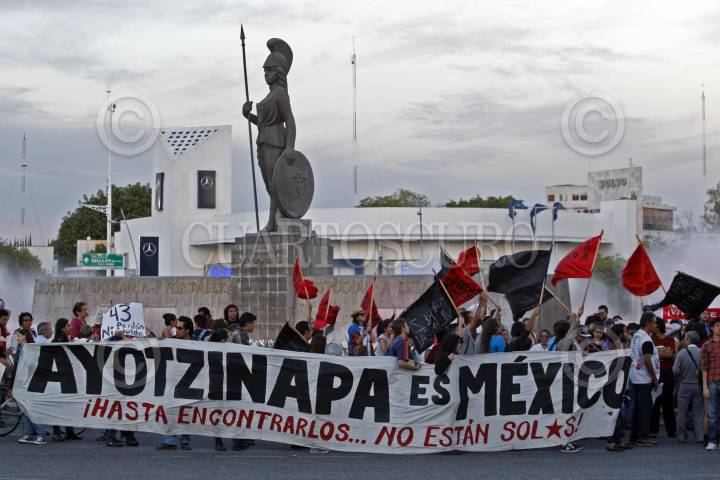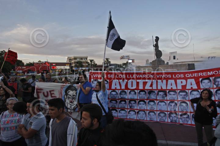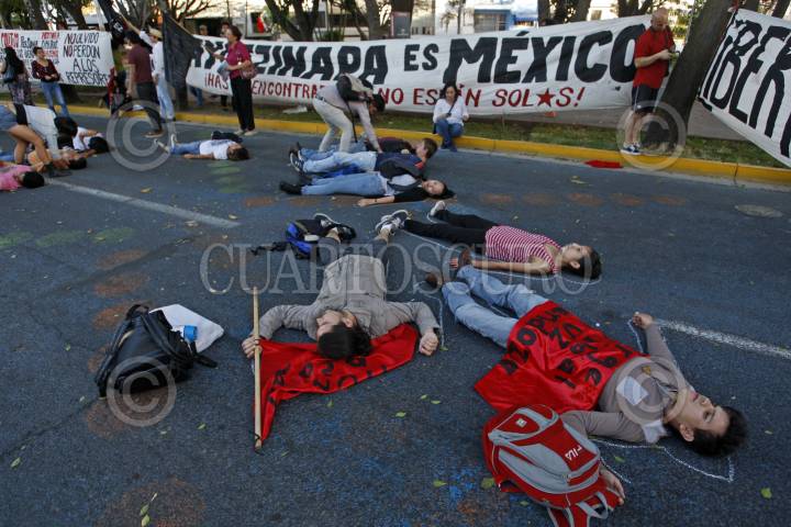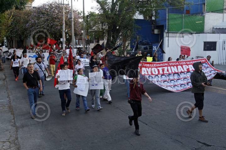 GUADALAJARA, JALISCO, 26FEBRERO2015.- Esta tarde a cinco meses de la desaparición de los Normalistas de Ayotzinapa, se llevo a cabo la Novena Jornada Global por Ayotzinapa en Jalisco, en donde decenas de personas protestaron por la causa, saliendo de los Arcos de Guadalajara, haciendo escala en el Tribunal Federal Electoral y como ultimo punto la Glorieta de la Minerva. FOTO: FERNANDO CARRANZA GARCIA / CUARTOSCURO.COM