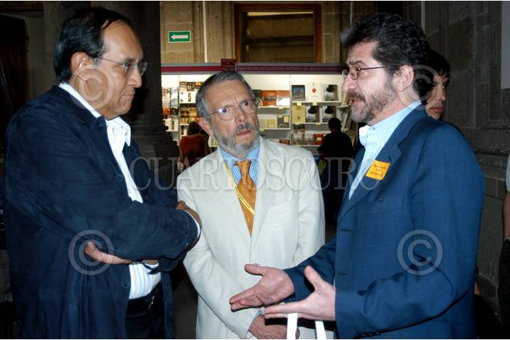 MÉXICO D.F. 25FEBRERO2007.- El periodista Raúl Trejo Delarbre, acompañado de José Carreño Carlón y Rafael Peréz Gay momentos antes de su participación en la mesa redonda "Kapuscinski, periodista ensayista literato" esto dentro del marco de catividades de la fería internacional del Libro en el Palacío de Minería de la UNAM. FOTO: GUILLERMO PEREA/CUARTOSCURO.COM