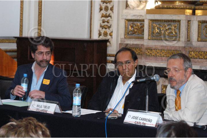 MÉXICO D.F. 25FEBRERO2007.- El periodista Raúl Trejo Delarbre, acompañado de Rafael Peréz Gay, durante su participación en la mesa redonda "Kapuscinski, periodista ensayista literato" esto dentro del marco de catividades de la fería internacional del libro en el Palacío de Minería de la UNAM. FOTO: GUILLERMO PEREA/CUARTOSCURO.COM