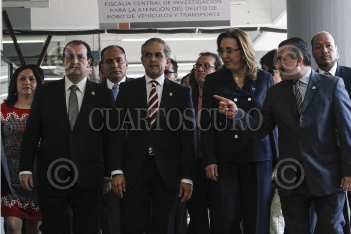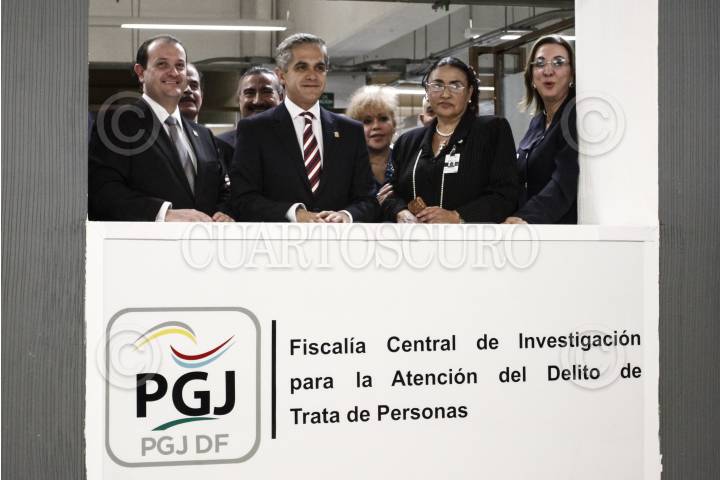 MÉXICO, D.F., 22MAYO2013.- El procurador Rodolfo Fernando Ríos Garza, Miguel Ángel Mancera, jefe de gobierno capitalino, la fiscal Juana Camila Bautista Rebollar y Rosy Orozco, presidenta de la Comisión Unidos contra la Trata, durante la presentación de la Fiscalía Central de Investigación para la Atención del Delito de Trata de Personas. FOTO: ISAAC ESQUIVEL /CUARTOSCURO.COM