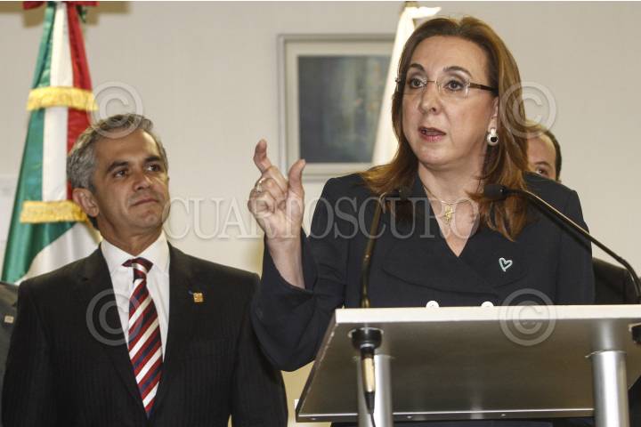 MÉXICO, D.F., 22MAYO2013.- Miguel Ángel Mancera, jefe de gobierno capitalino, y Rosy Orozco, presidenta de la Comisión Unidos contra la Trata, durante la presentación de la Fiscalía Central de Investigación para la Atención del Delito de Trata de Personas. FOTO: ISAAC ESQUIVEL /CUARTOSCURO.COM