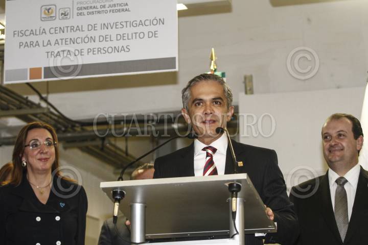 MÉXICO, D.F., 22MAYO2013.- El procurador Rodolfo Fernando Ríos Garza, Miguel Ángel Mancera, jefe de gobierno capitalino, y Rosy Orozco, presidenta de la Comisión Unidos contra la Trata, durante la presentación de la Fiscalía Central de Investigación para la Atención del Delito de Trata de Personas. FOTO: ISAAC ESQUIVEL /CUARTOSCURO.COM
